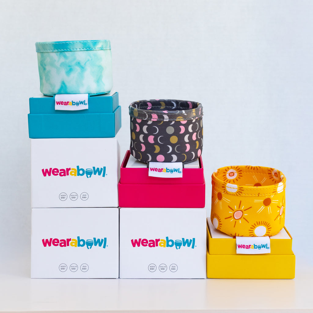 Turquoise pet bowl with a strap and 'Wearabowl'.