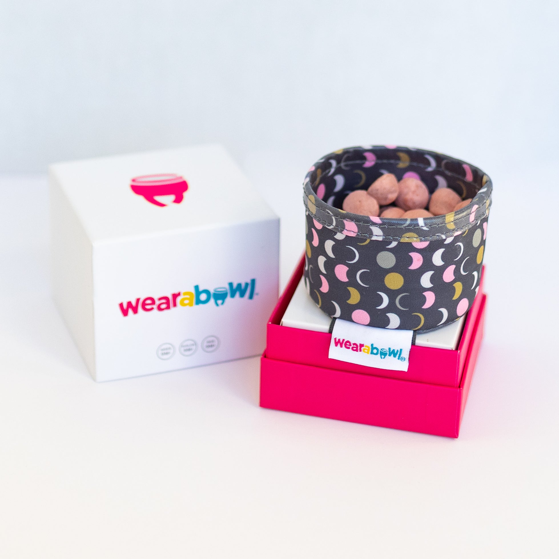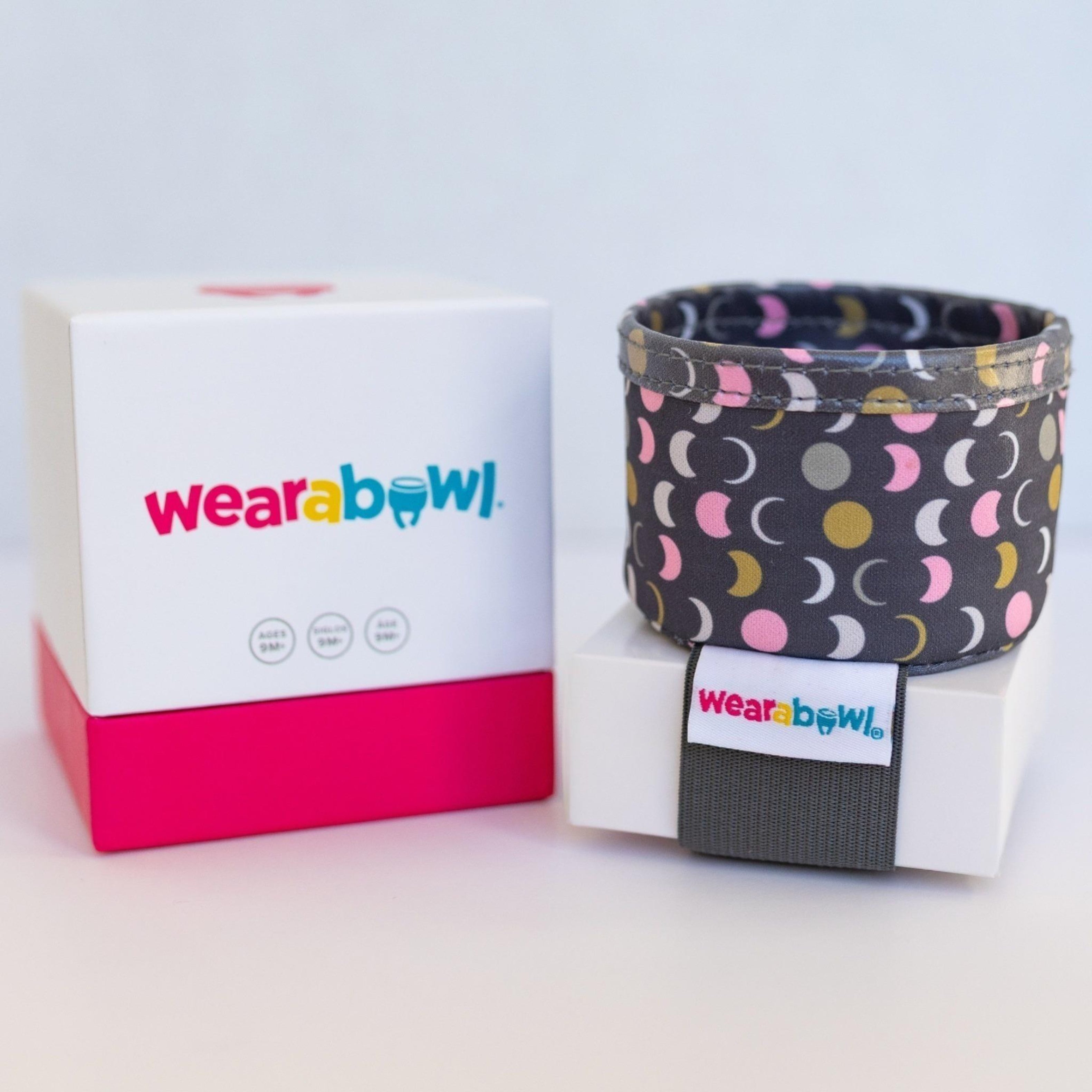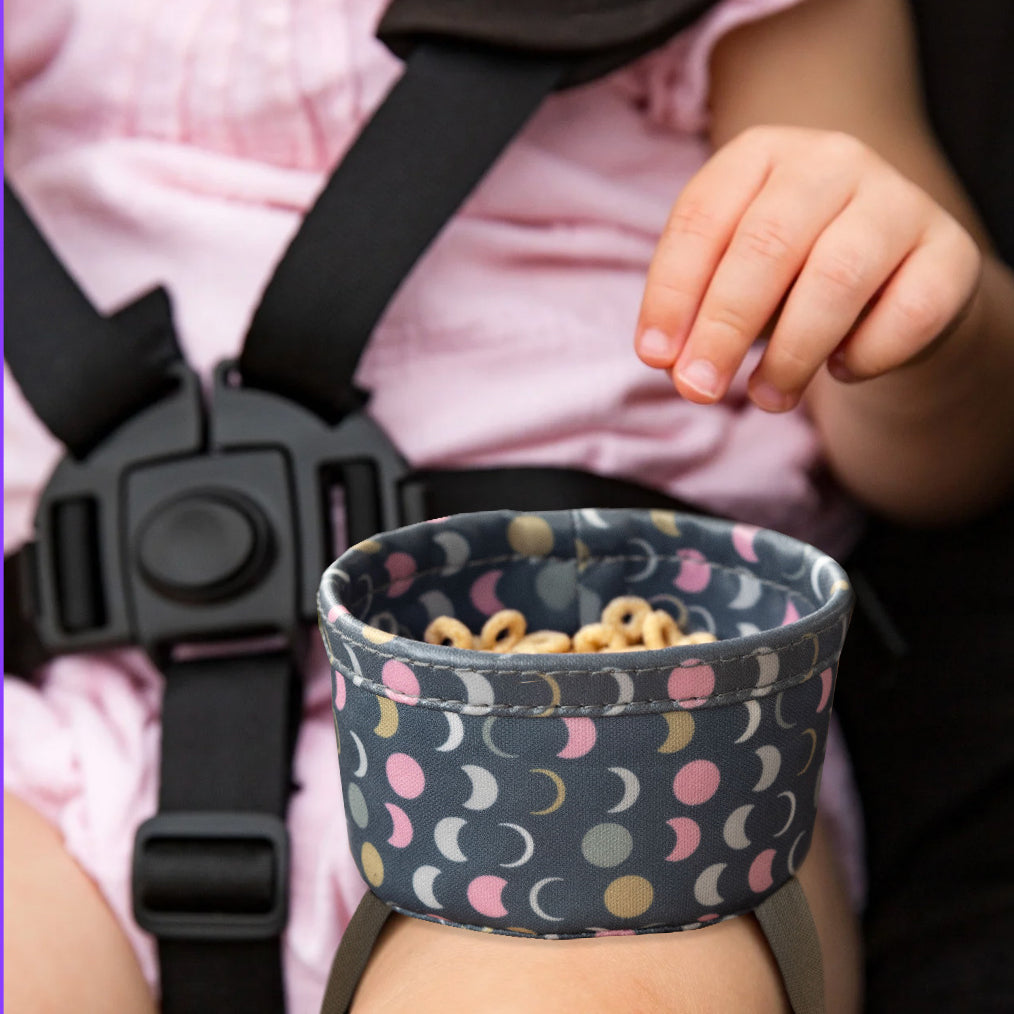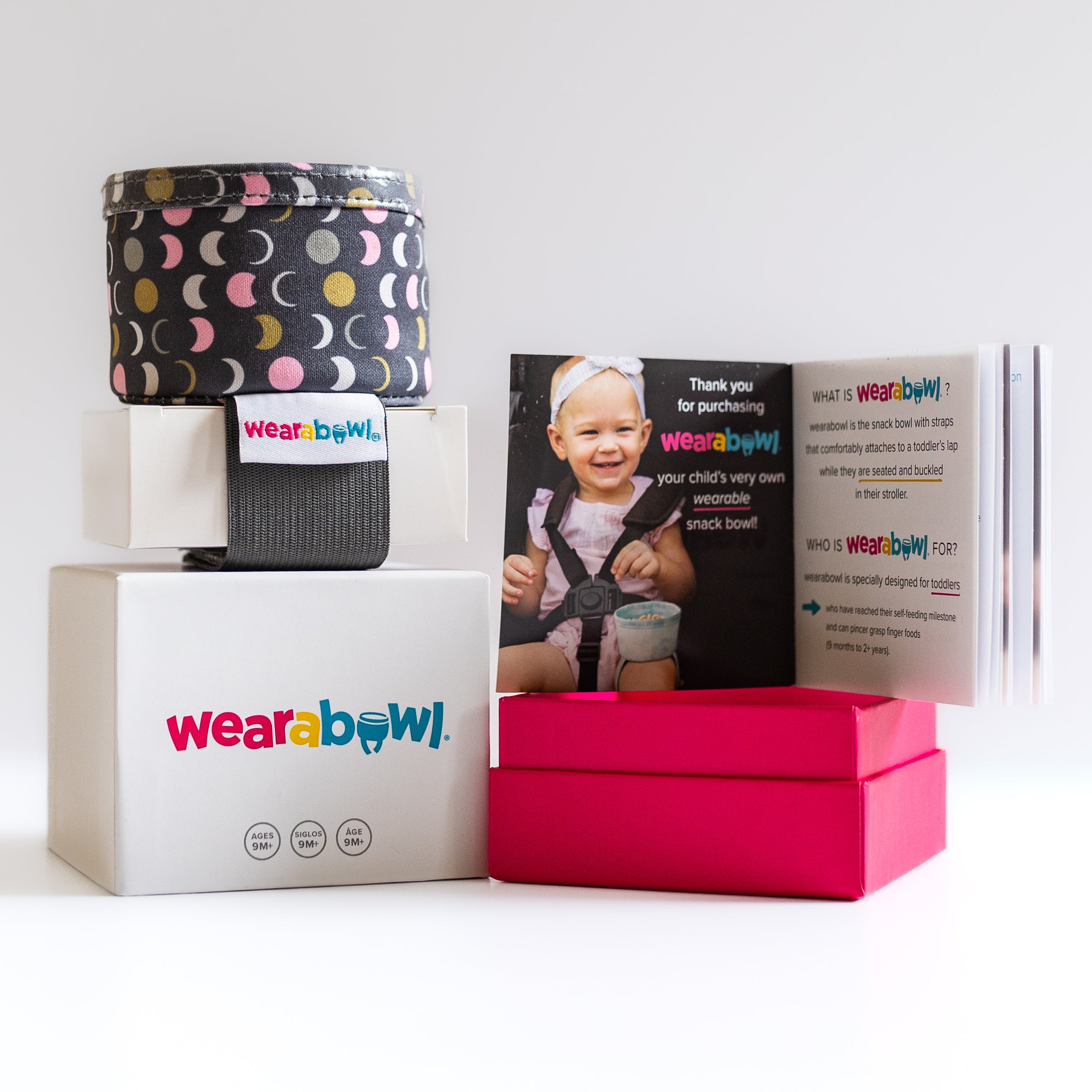 wearabowl is a specially designed bowl with flexible straps that comfortably attach around a child’s thigh when they are seated and buckled in their stroller. It stays secure in place atop the child’s lap, enabling them to feed themselves in the most natural, comfortable way – which is especially convenient for toddlers who’ve reached their pincer grasp milestone. No frustrations from dropped snack cups or out of reach snacks – a win-win for both children and parents! Simple, lightweight and compact - wearabowl can be taken anywhere, anytime. It easily fits into a diaper bag, purse, pocket or attaches to a stroller handle or adult wrist for quick access.