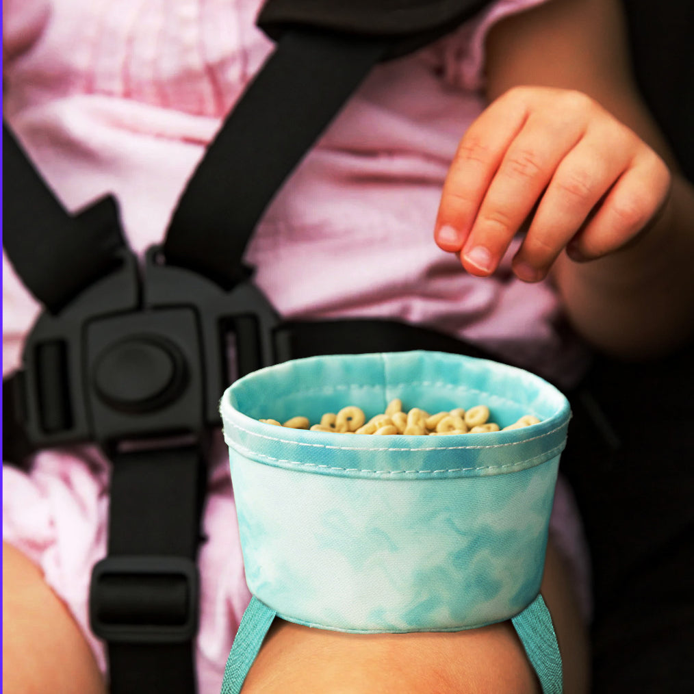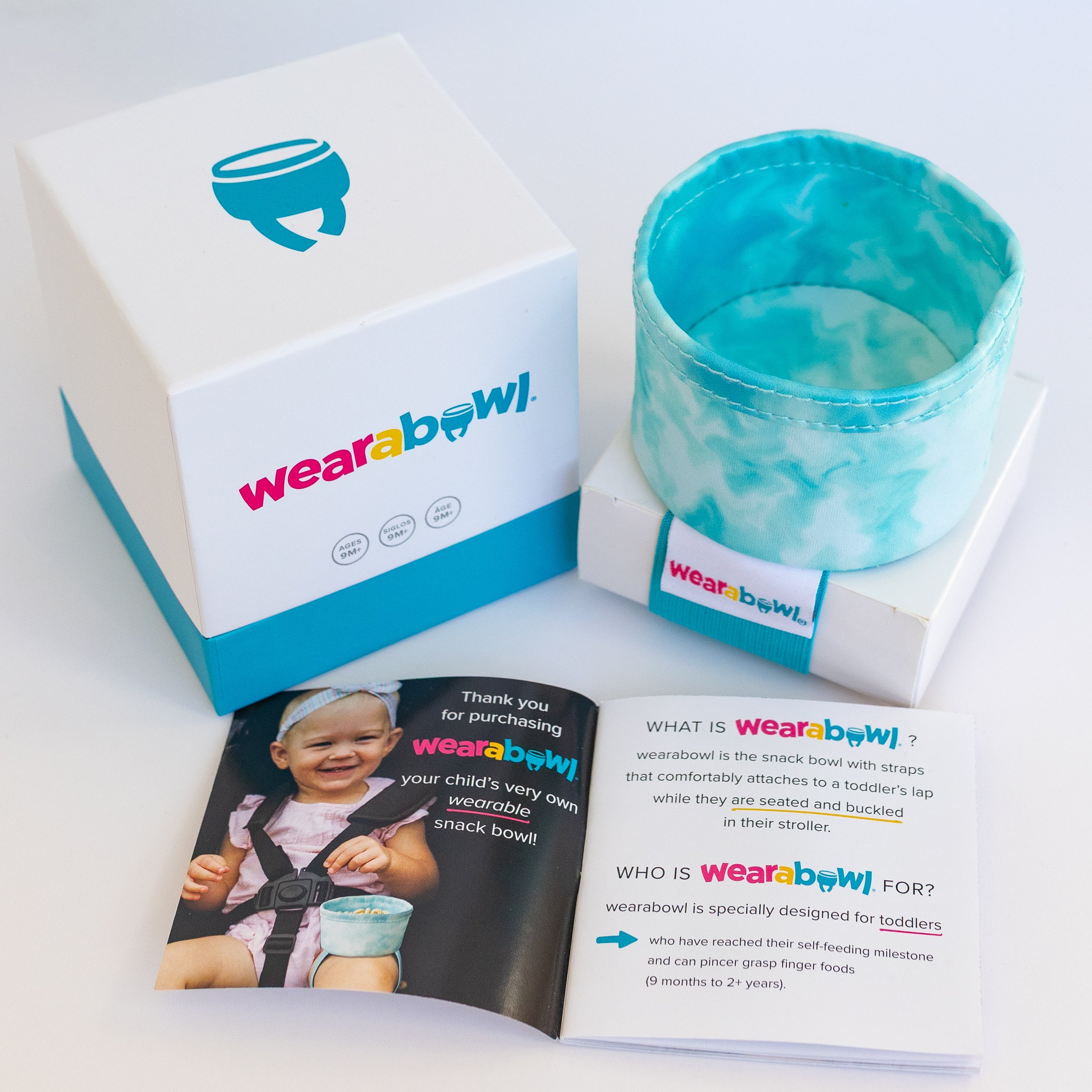 wearabowl is a specially designed bowl with flexible straps that comfortably attach around a child’s thigh when they are seated and buckled in their stroller. It stays secure in place atop the child’s lap, enabling them to feed themselves in the most natural, comfortable way – which is especially convenient for toddlers who’ve reached their pincer grasp milestone. No frustrations from dropped snack cups or out of reach snacks – a win-win for both children and parents! Simple, lightweight and compact - wearabowl can be taken anywhere, anytime. It easily fits into a diaper bag, purse, pocket or attaches to a stroller handle or adult wrist for quick access.